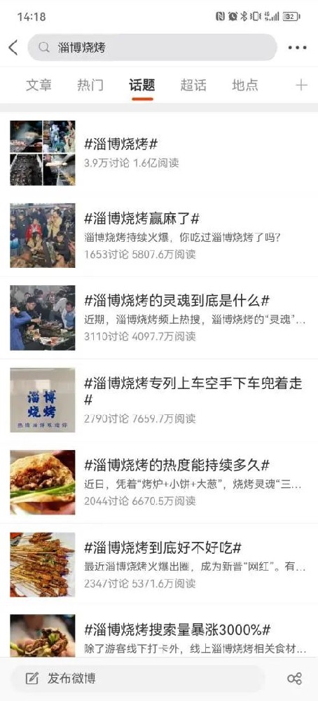 在短视频平台热榜搜索量高达525.3万;#淄博烧烤永远的神#微博阅读量更是高达2.3亿。