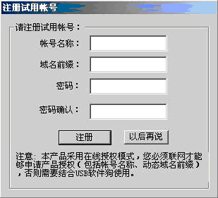 (6)如果选择“否”或是没有帐号的情况下,系统会出现下图中的提示。填写试用账号和密码及其他相关信息,用友T+3远程通会自动生成一个试用的域名。填写帐号及密码后,点击“注册”,注册用友T+3远程通远程接入软件。【例如:填写用户名为“gnwayqwe”,点击注册后,系统会自动生成一个配置帐号。试用期为15天; 并发数为5 。】如下图: