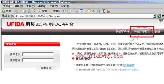 (3)用友T3远程通客户端虚拟打印机驱动安装:在远程通服务器配置完成后,在客户端浏览器打开其网址,即可在网页中下载远程通虚拟打印驱动安装程序,如下图: