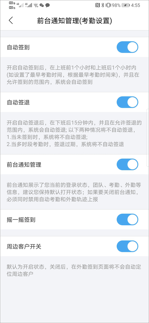 为避免考勤遗漏,员工可设置在上班15分钟前或者下班15分钟前进行签到签退提醒;同时还支持自动签到签退的设置,可在上班前1个小时或者下班后15分钟,并在允许签到签退的范围内,系统自动帮你打卡。